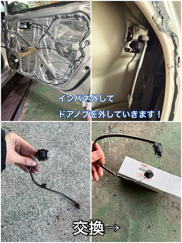 ドアノブを外さないといけないので…ドアのインパネを外しコネクター類を外していきます。冬場なので固い…ツメやピンを割らないように気をつけて外します。リクエストスイッチのコネクターを外してドアノブを外してスイッチの交換し動作確認を行いました。