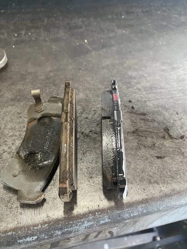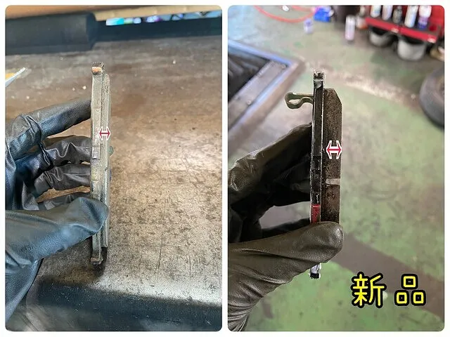 車検で入庫し整備を進めていくとフロントディスクパッドの摩耗が見受けられ交換が必要でしたのでお客様にお伝えし交換作業を行いました。ブレーキパッドの残量が2mm程度(新品で1cm程度)でした(-_-;) このまま交換せずに乗り続けてしまうとその他の部品が傷んでしまうことがあり修理費用も高くついてしまうところでした…今回はフロントディスクパッドのみの交換で作業が完了しました。